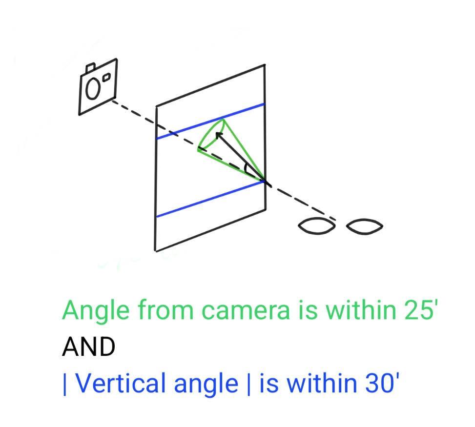 Essentially if the gaze vector lied in the intersection of the green cone and the blue boundaries, you held eye contact. If the vector’s vertical component ($vsin(\theta)$) fell below the lower threshold you were looking down. Now the problem in this (and the other two methods) is that the constant values for the thresholds come from manually watching the videos and tweaking knobs until the counts matched our own.
