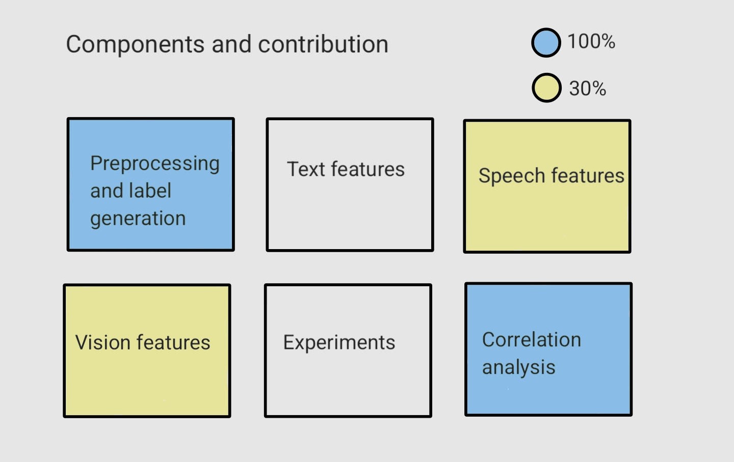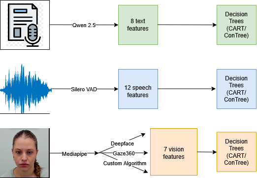 Our final solution involved two stages. First, we extract interpretable features for the three modalities [vision, speech, and text] using different pre-trained deep learning methods. Second, we train Decision Trees on these features to predict the ratings. This division allows for independent development across individual modalities, making combining different results trivial. A visual representation is shown below.