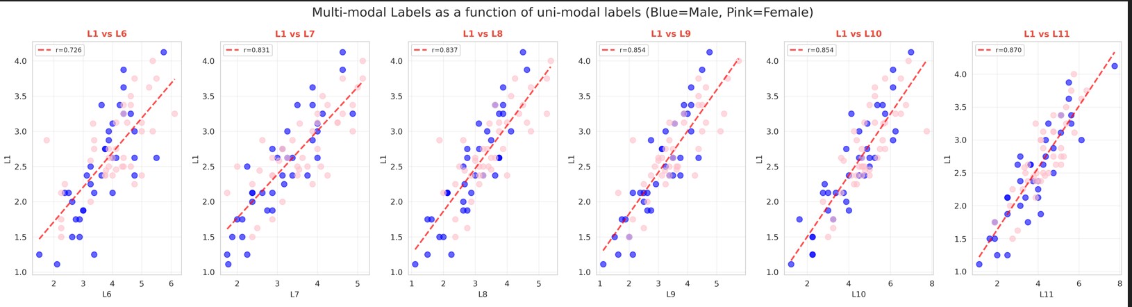 This result suggests that modeling can focus predicting the easiest sub-modality using explainable features, with the results subsequently used to infer multi-modal labels. This simplifies the approach while maintaining strong performance.