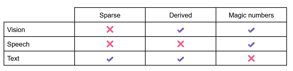 In the case of vision and speech, there was only a single label to predict. This made the experimental setup very easy. For the speech modality CART trees of depth 2 (super shallow) beat the baseline by ~15%. On the vision modality, CART trees of depth 3 (still super shallow) were able to beat the baseline by ~26%.